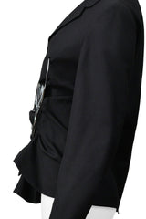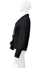 Resurrection Vintage is excited to offer a vintage Junya Watanabe black jacket featuring multiple metal rings, notched lapels, a gathered front, and a hidden back zipper.