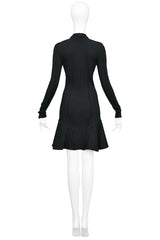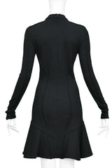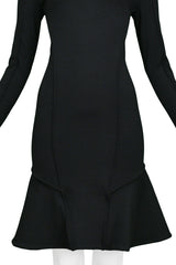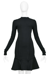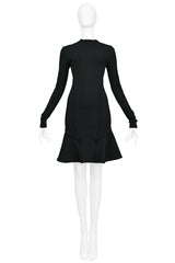 Resurrection Vintage is excited to offer a vintage Balenciaga by Nicolas Ghesquière black jersey "scuba" dress featuring a high collar, long skinny sleeves with cuffs, side seams, flounce hem, and center back zipper.