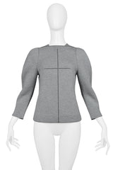 Resurrection Vintage is pleased to offer a vintage Balenciaga by Nicolas Ghesquiere grey neoprene top featuring 3/4 length sleeves, high neckline, cross seaming detail at the center front and back, and center back zipper.