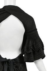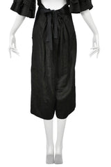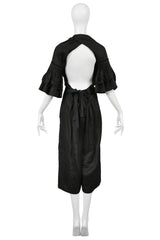 Resurrection is pleased to offer this vintage Tao for Comme des Garcons black linen jumpsuit featuring a ruffle neckline, 3/4 bell sleeves, an exposed back, tie back, and cropped legs.