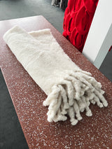 Resurrection Vintage is excited to offer a Celine by Phoebe Philo off-white mohair blanket featuring giant fringe, a luxurious texture, and an oversized Celine label. These unique blankets were shown on the Celine runway in 2017 (see photo). This blanket has original tags and has not been used.