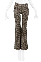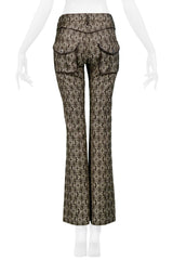 Resurrection Vintage is excited to offer a pair of vintage Gianfranco Ferre brown logo bootcut pants featuring large F logos, brown leather trim, leather belt loops, silver-tone rivets, front pockets, and cargo back pockets.