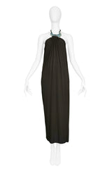 Resurrection Vintage is excited to offer a vintage Jean Paul Gaultier olive green silk jersey wrap gown featuring an abalone collar that ties at neck, open back & matching bikini bottoms. Spring / Summer 2000 Collection.