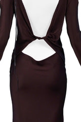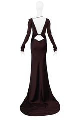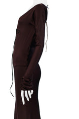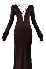 Resurrection Vintage is excited to offer this stunning vintage dark brown Tom Ford for Gucci silk gothic-inspired evening gown: featuring long slinky sleeves, criss-cross laces, a deep V neckline, an open back, keyhole back, gown length with train.