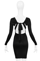 Resurrection Vintage is excited to offer a stunning vintage Tom Ford for Gucci, black jersey mini dress featuring a twist bodice with cutout, criss-cross straps that wrap around the body and tie in the back, long sleeves, and above the knee length.