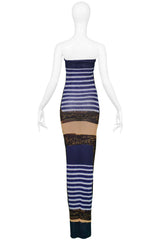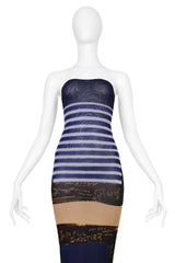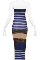 Resurrection Vintage is excited to offer a vintage Jean Paul Gaultier strapless dress featuring iconic French nautical stripes, signature print, mesh fabric, and body-con fit. From the 2001 collection.