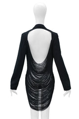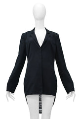 Resurrection Vintage is excited to offer a vintage Jil Sander by Raf Simons navy blazer with hidden button closure, notch collar, and open back with fringe.