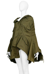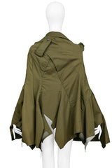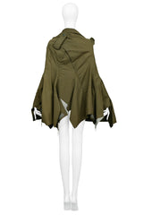 Resurrection Vintage is excited to offer a vintage Junya Watanabe for Comme Des Garcons army green deconstructed military-inspired cape featuring an asymmetrical hem, patch pockets, and zipper accents.