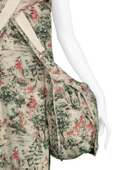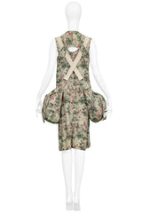 Resurrection Vintage is excited to offer a vintage Junya Watanabe linen pictorial print parachute double bag dress. The parachute dress features a pink, green, and black country scene print on an off-white background, tank sleeves, a keyhole back, criss-cross parachute straps, and mini duffle bags at each side with pockets and zippers.
