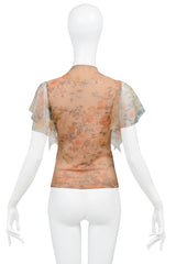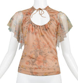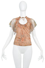 Resurrection Vintage is excited to present a vintage Plein Sud peach top featuring two layers, floral print, keyhole neckline with leather ties, flutter sleeves, and hip length.