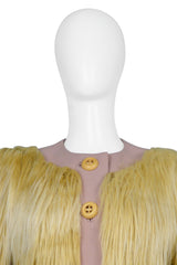 Resurrection Vintage is excited to offer a vintage Prada camel wool and yellow mohair faux fur mod jacket featuring large yellow round buttons, variegated mohair fur along front and sleeves, and no collar.