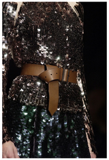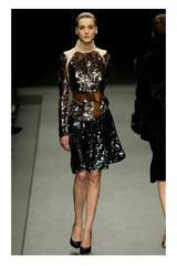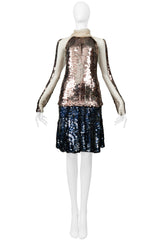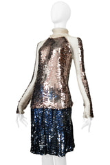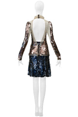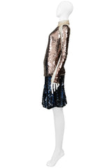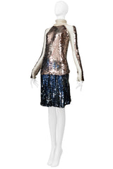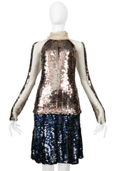 Resurrection Vintage is excited to offer a vintage Prada gold & navy metallic round paillette skirt ensemble from the 2002 collection. This iconic ensemble features a metallic top and navy skirt, mix of silver and bronze sequins, long sheer sleeves, a high tulle neckline, and an open back.
