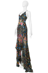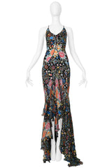 Resurrection Vintage is thrilled to present a vintage Roberto Cavalli evening gown featuring a multi-color floral print with gold fleck detailing, slip dress neckline, bust to waist outlining on front, sheer ruffle layers from hips to bottom with a high-low cut, and gown length.