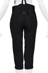 Resurrection Vintage is excited to offer a pair of vintage Alexander McQueen black tuxedo pants with braces from the 2007 collection. The knickers have a center-back metal buckle panel, panels down the center front and back, and a mini slit at the bottom pant edges. The leather and fabric suspenders or braces are attached with fabric buttons and include adjustable hardware on straps.