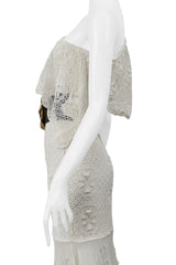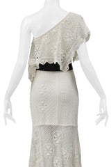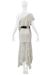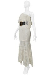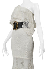 Resurrection Vintage is excited to offer an Alexander McQueen white knitted dress with black belt, featuring an asymmetrical neckline, one short sleeve, floral ruffles at the bust and shoulder, a fitted silhouette, sheer lace hem, large black belt with gold buckle, and an ankle length design.