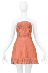 Resurrection Vintage is thrilled to offer a vintage Alexander McQueen pink pleated strapless dress featuring a pleated bodice, ruffled hem, bell silhouette, invisible zipper at the side, and above the knee length. This dress has never been worn and comes with original tags.