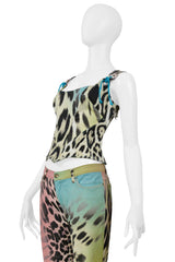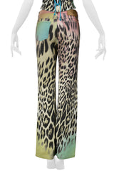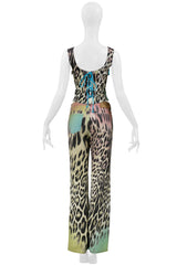 ROBERTO CAVALLI MULTI COLOR LEOPARD PRINT CORSET AND DENIM PANTS ENSEMBLE