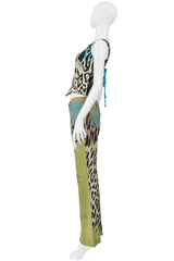 Resurrection Vintage is thrilled to offer a vintage Roberto Cavalli multi-color leopard print matching corset and denim pants ensemble. The top features blue cord ties that lace up in the back, blue stitching, and a fairy zipper pull. The pants have a straight leg, mixed leopard and cheetah print throughout, and a Cavalli patch at the back waist.