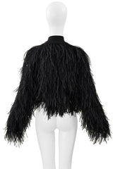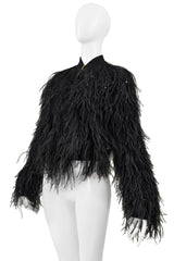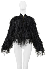 Resurrection Vintage is excited to offer a black feather bomber jacket adorned with black feathers and black sequins sewn into its body, featuring a brass zipper at the center.