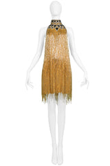 Resurrection Vintage is excited to present a stunning vintage Bob Mackie gold and black beaded dress with high neck, open exposed back, a center back zipper, and mini length. The dress has silk interior lining.