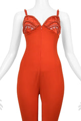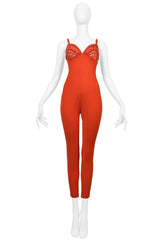 Resurrection Vintage is delighted to offer a vintage Byblos red catsuit featuring red satin cup overlay, red beaded line detailing over cups, zipper down center front, darts at sides, invisible zipper up ankles, and beaded shoulder straps, crossing at back.