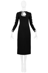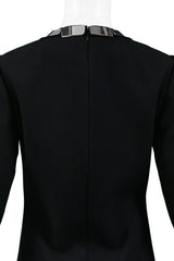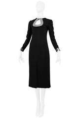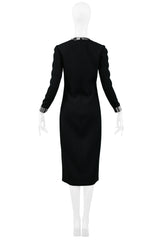 Resurrection Vintage is excited to offer this vintage Pierre Cardin black wool cocktail dress that features an attached chrome metal necklace and bracelet cuffs, slim body, center front slit, center back zipper and below the knee length. Excellent original vintage condition.