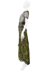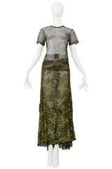 Resurrection Vintage is excited to offer a vintage Comme des Garçons green camouflage polka dot skirt and mesh top from the 2001 collection. The ensemble features camouflage strip appliques throughout the skirt, a flowy hem, sheer top and skirt, and is ankle-length.