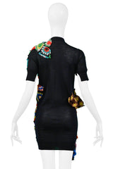 Resurrection Vintage is excited to offer a vintage Comme des Garcons button-front black knit cardigan sweater dress with multicolor Afghan knit appliqué at front. From the 2009 collection.