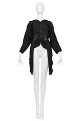 Resurrection Vintage is excited to offer a vintage Comme des Garcons black wool and chiffon ruffle jacket featuring three-quarter length sleeves, button front, flap collar, sheer waistline, ruffles, raw edges, and uneven hem.