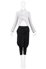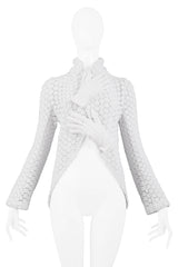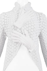 Resurrection Vintage is excited to offer a vintage Comme des Garcons white knit glove top featuring two white padded gloves, a fancy stretch knit, high collar, fitted bodice, and tuxedo style short front and longer back body.
