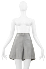 Resurrection Vintage is excited to offer a vintage Chanel by Karl Lagerfeld grey leather walking shorts featuring a center front zipper and button at the waistband, pleated side details, flat back, and easy A-line body.