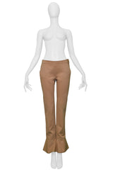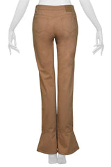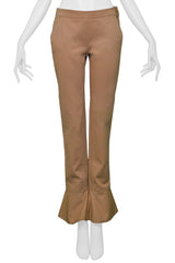 Resurrection Vintage is excited to offer a pair of vintage Chanel khaki cotton flared pants featuring, front side pockets, back patch pockets, a side zipper, straight legs, flared ankles, and a "CC" patch on the back waistband.