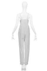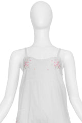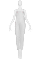 Resurrection Vintage is excited to offer a vintage Chantal Thomass white cotton jumpsuit with pink floral embroidery, front patch pocket, easy body, and gathered pant hem.
