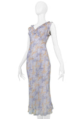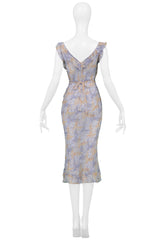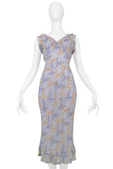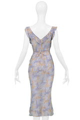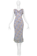 Chloé light blue chiffon 40s-style day dress featuring, flounce sleeves, v-necklaine, side button detail, delicate abstract print, and over the knee length.
