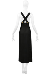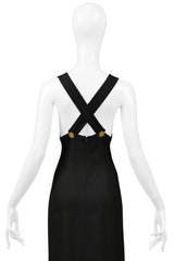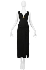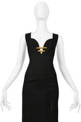 CHRISTIAN LACROIX BLACK LINEN HOLLYWOOD DRESS WITH GOLD TONE HARDWARE & DRAMATIC SLIT