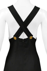 Resurrection Vintage is excited to offer a vintage Christian Lacroix black Hollywood dress featuring gold textured rods at front, a sweetheart neckline, criss-cross straps at back, detailed gold buttons at backcrosses, 3/4 length, a dramatic slit on right leg, thick shoulder straps, and zipper at back.