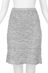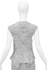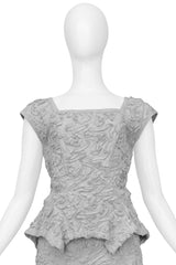 Resurrection Vintage is excited to offer a vintage Comme des Garcons grey top and skirt ensemble with ribbon detailing. The ensemble features a cap-sleeve design and square neckline top, embossed ribbon detailing throughout, and fitted knee-length skirt.