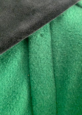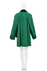 Resurrection Vintage is excited to offer a vintage Moschino green wool swing coat featuring black velvet buttons, tabs, and collar, and black velvet coin purses with gold frames, and black lining.