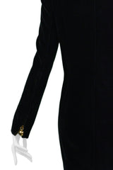 Resurrection Vintage is excited to offer a vintage Moschino black cotton velvet coat dress featuring a folding collar, zipper front, patch pockets, long sleeves, fitted body, and gold balls.