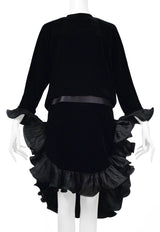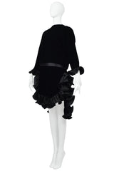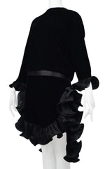 Resurrection Vintage is excited to offer this vintage Pierre Cardin black velvet cocktail dress that features taffeta ruffles, long sleeves, ribbon waistband, and high low length.