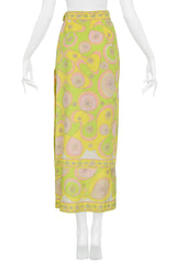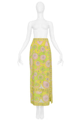 Resurrection Vintage is excited to offer a vintage Emilio Pucci yellow and pink cotton hostess maxi skirt featuring an abstract print with "Emilio" signature, side snaps that can be opened to make a side slit, and long body.