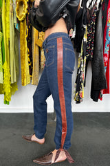 Resurrection is delighted to offer a pair of vintage Christian Dior jeans from the 2005 collection featuring brown leather detailing down the sides that tie and scrunch jeans at bottom, front patch pockets, brown buttons on pockets, and front zipper closure with brown button.