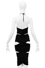 Resurrection Vintage is excited to offer a vintage Dolce & Gabbana black stretch slit dress featuring drawstrings to create ruching down the middle front and back of the dress, 3 open slits on each side seam of the dress, and a halter with strings to tie at the neck.