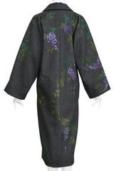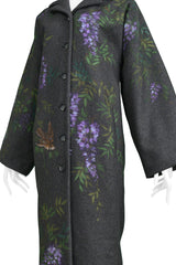Resurrection Vintage is excited to offer a vintage Dolce & Gabbana grey wool kimono shaped coat featuring a button front, handpainted birds and flowers, a notch folding collar, and nude lining.