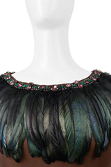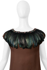 Resurrection Vintage is excited to offer a vintage Dolce & Gabbana brown mini dress featuring pink and green crystal rhinestones around the neckline, a collar of black feathers, a straight body, black feathers at the hem, and a side zipper closure.