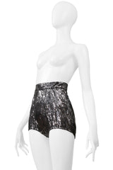 Resurrection Vintage is excited to offer a pair of Dolce & Gabbana gunmetal grey hot pants featuring metallic sequins, a high waistband, elastic bands at the legs, and a side zipper.
