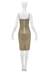 Resurrection Vintage is excited to offer a vintage Dolce & Gabbana khaki corset dress featuring, lace-up detailing and zippers down the front of the dress, satin trim along the top of the dress, and a kick pleat in the back.