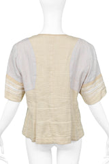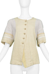 Resurrection Vintage is excited to offer a vintage Dries Van Noten ivory top featuring an asymmetrical front, button front closure, and multi-colored sleeves.