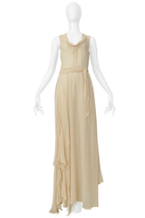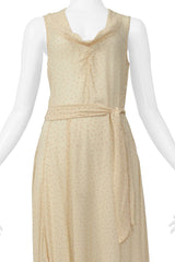 Resurrection Vintage is excited to offer a vintage Dries Van Noten creamy beige silk maxi dress featuring burnt orange mini polka dots, a cowl collar neckline, asymmetrical seaming, side buttons, droopy flounces, side slit, an uneven hem, matching belt, and maxi length.