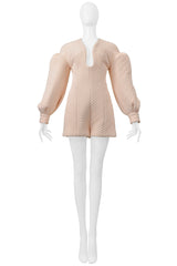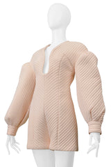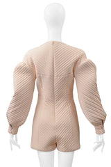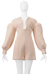 Resurrection Vintage is excited to offer a stunning Fendi soft pink padded romper jumpsuit featuring deep cutout at the neckline, sculptural sleeves, button cuffs, and romper shorts.